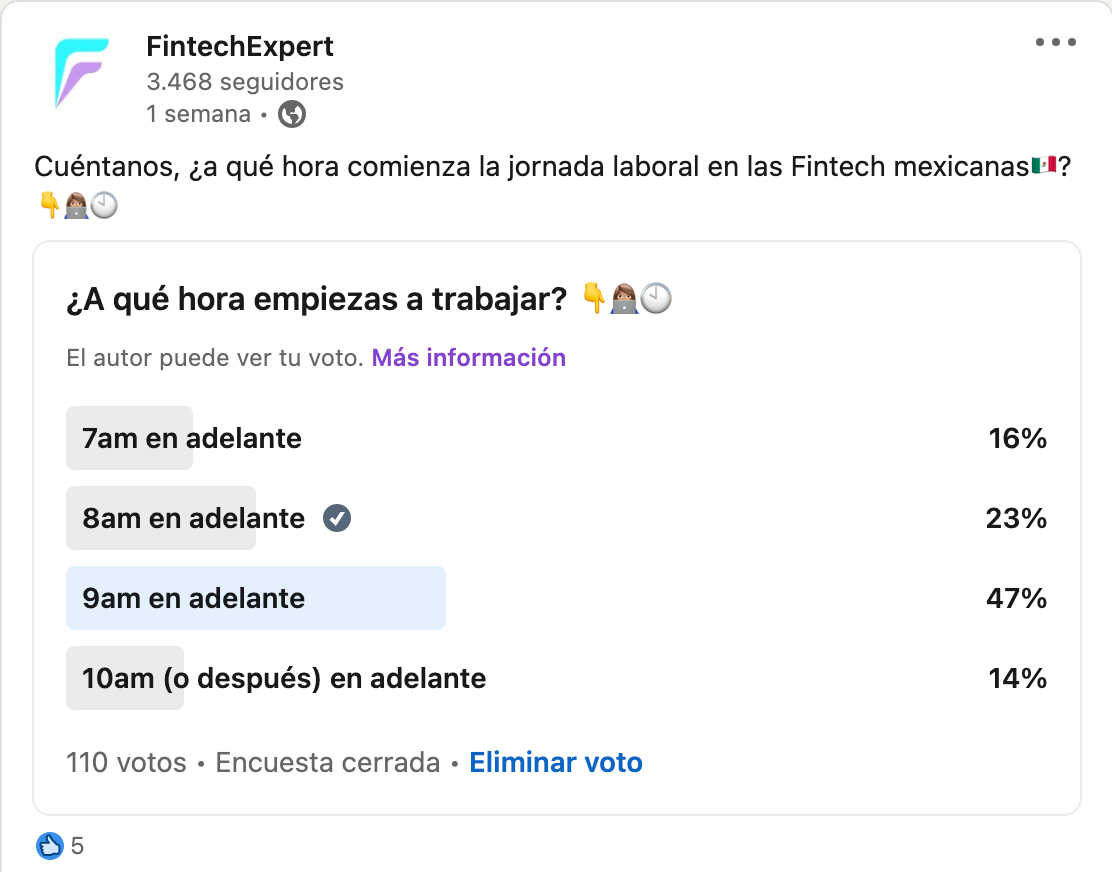 Lanzamos a cabo una encuesta para conocer la hora de inicio en la jornada laboral en las firmas Fintech mexicanas.