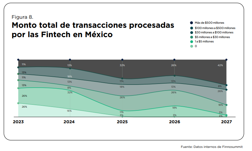 Proyecciones de crecimiento: Se estima que para 2027, hasta el 76% de las Fintech de Payments & Remittances procesarán volúmenes anuales superiores a los 30 millones de dólares.