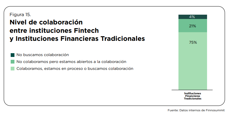 Quizá uno de los datos más reveladores es que el 75% de las Fintech mexicanas colaboran o se encuentran en proceso de colaborar con instituciones financieras tradicionales. México se posiciona así como uno de los países con mayor apertura a la co-creación e innovación abierta en la región.
