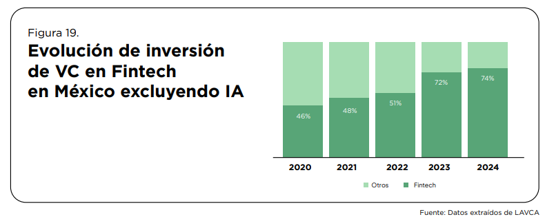 Otro de los puntos focales del Finnovista Fintech Radar México 2025 es que la inversión de venture capital en Fintech sigue en ascenso, representando el 74% de todo el capital de riesgo invertido en México en 2024. Este dominio indica la confianza de los inversores en la resiliencia y rentabilidad del sector.